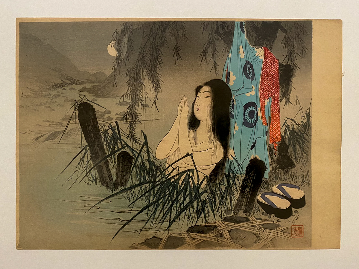 昨年、幻の作品が公開され話題になった鏑木清方。日本画の美人画で知られますが、木版口絵(もくはんくちえ)で清方と並ぶ人気を誇っていたのが鰭崎英朋でした。両名を中心に、明治〜大正期に同じ分野で活躍した絵師を紹介する展覧会が、太田記念美術館で開催中です。