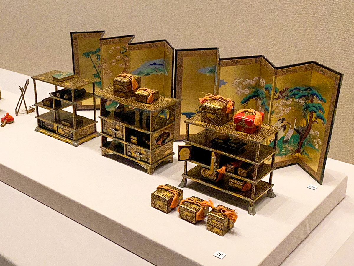 「牡丹唐草文の雛道具」牡丹唐草文三棚(厨子棚・黒棚・書棚)、花鳥図屏風 株式会社虎屋