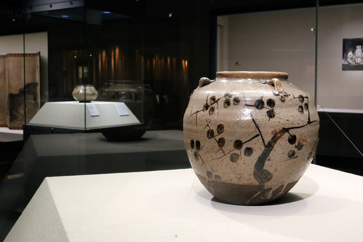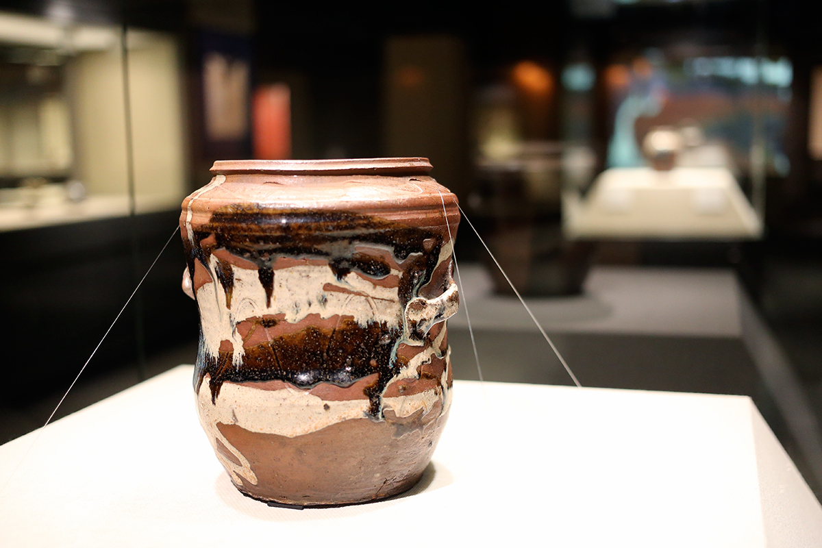 (右手前)重要文化財《絵唐津柿文三耳壺》桃山時代