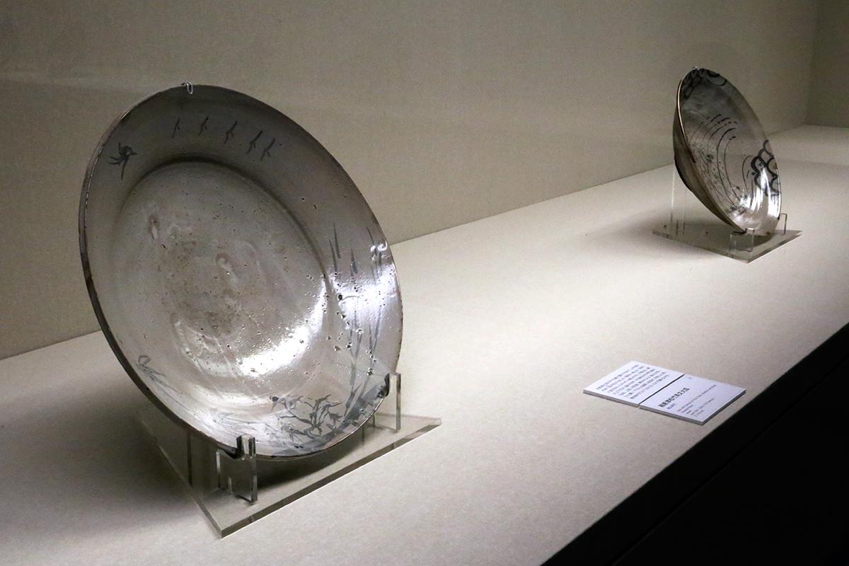 (左から)《絵唐津松竹鳥文大皿》桃山時代 / 《絵唐津葦文大皿》桃山時代