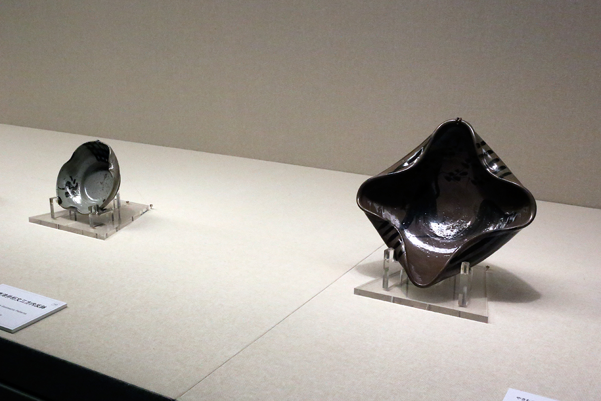 (左から)《絵唐津井桁文三方内反鉢》桃山時代 / 《絵唐津山水文四方内反鉢》桃山時代