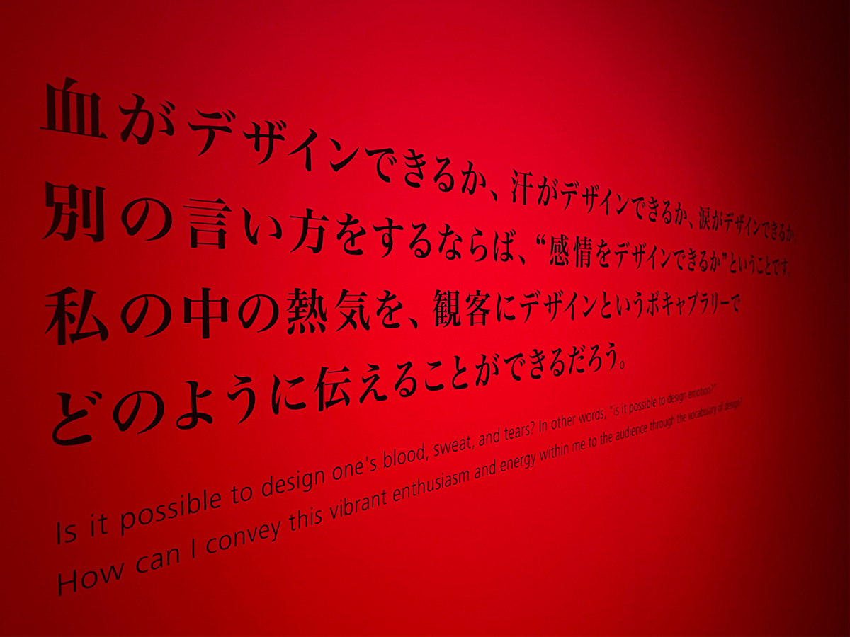 展覧会では石岡の仕事の全容を、デザインのプロセスを示す膨大な資料とともに紹介。会場は人間の身体の躍動感を根源に宿す「赤」がキーカラー。壁面には石岡による言葉も紹介されており、冒頭には展覧会タイトルになった「血がデザインできるか…」のワードもある。