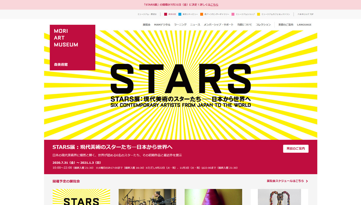 新型コロナウイルスの影響で2月29日(土)から休館が続いていた森美術館は、開幕を延期していた「STARS展:現代美術のスターたち― 日本から世界へ」を2020年7月31日(金)~2021年1月3日(日)に変更して開催すると発表した。