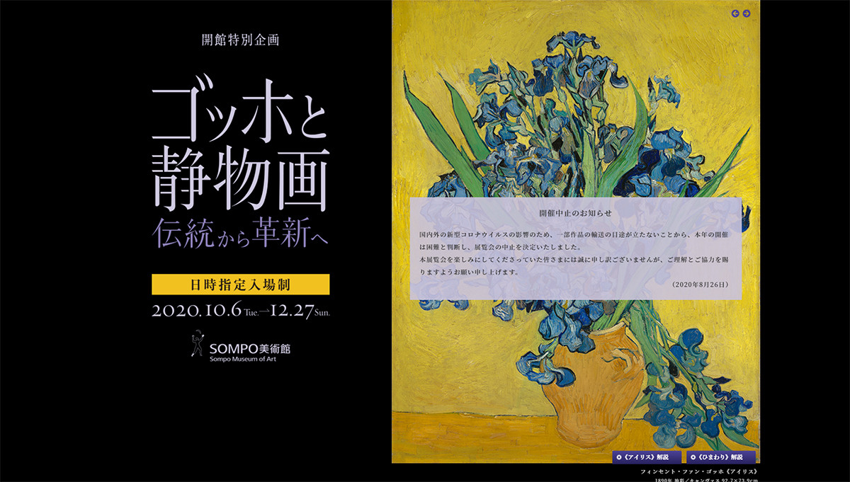 SOMPO美術館は、2020年10月6日(火)〜12月27日(日)の開催を予定していた「ゴッホと静物画 ― 伝統から革新へ」の開催中止を発表した。