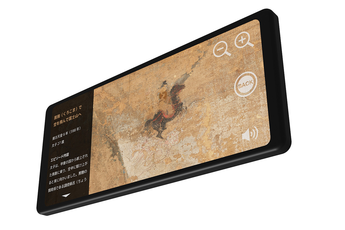 「魔法のグラス」は、Nreal Ltd.が開発したARグラス「NrealLight」を用いた体験。絵伝の前でARグラスをかけると、聖徳太子が弓を弾いたり、黒駒に乗って富士山を飛び越えたりと、15のエピソードがアニメーションで登場する。