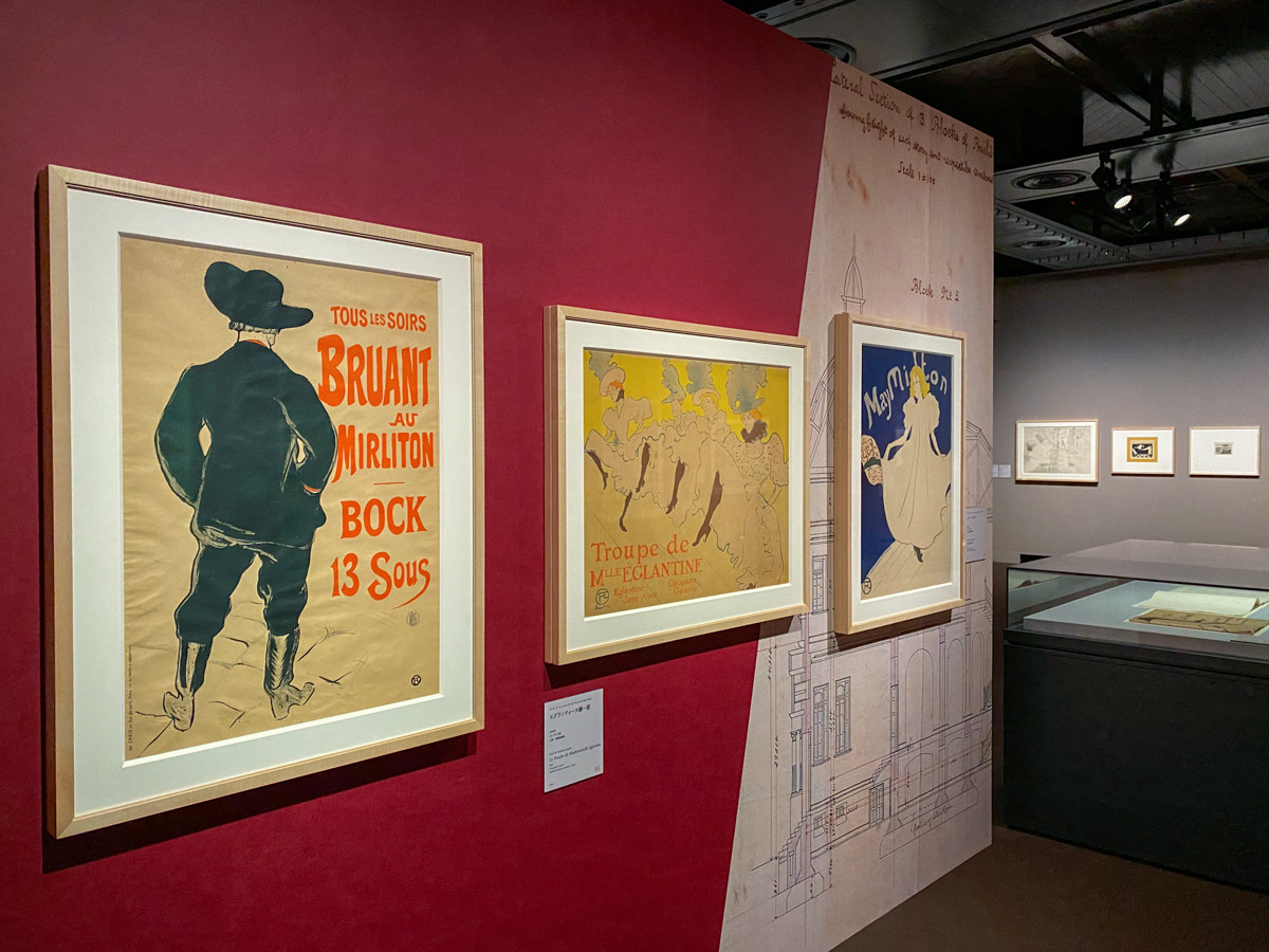 第3章は「画家=版画家 トゥールーズ=ロートレック」。モンマルトルに住みながら、身の回りの人々をモデルに絵を描いていたトゥールーズ=ロートレック。1891年、カラー・リトグラフ(多色石版画)の《ムーラン・ルージュ、ラ・グーリュ》で、一躍スターダムに躍り出ました。