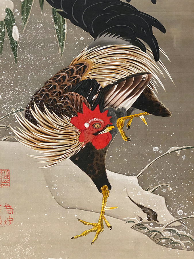 《花卉雄鶏図》は30代後半の作品です。鶏の首のあたりは裏彩色が用いられており、実に細やかな描写が魅力的。若冲は自宅の庭に数十羽のニワトリを飼い、写生を重ねて描写を極めました。