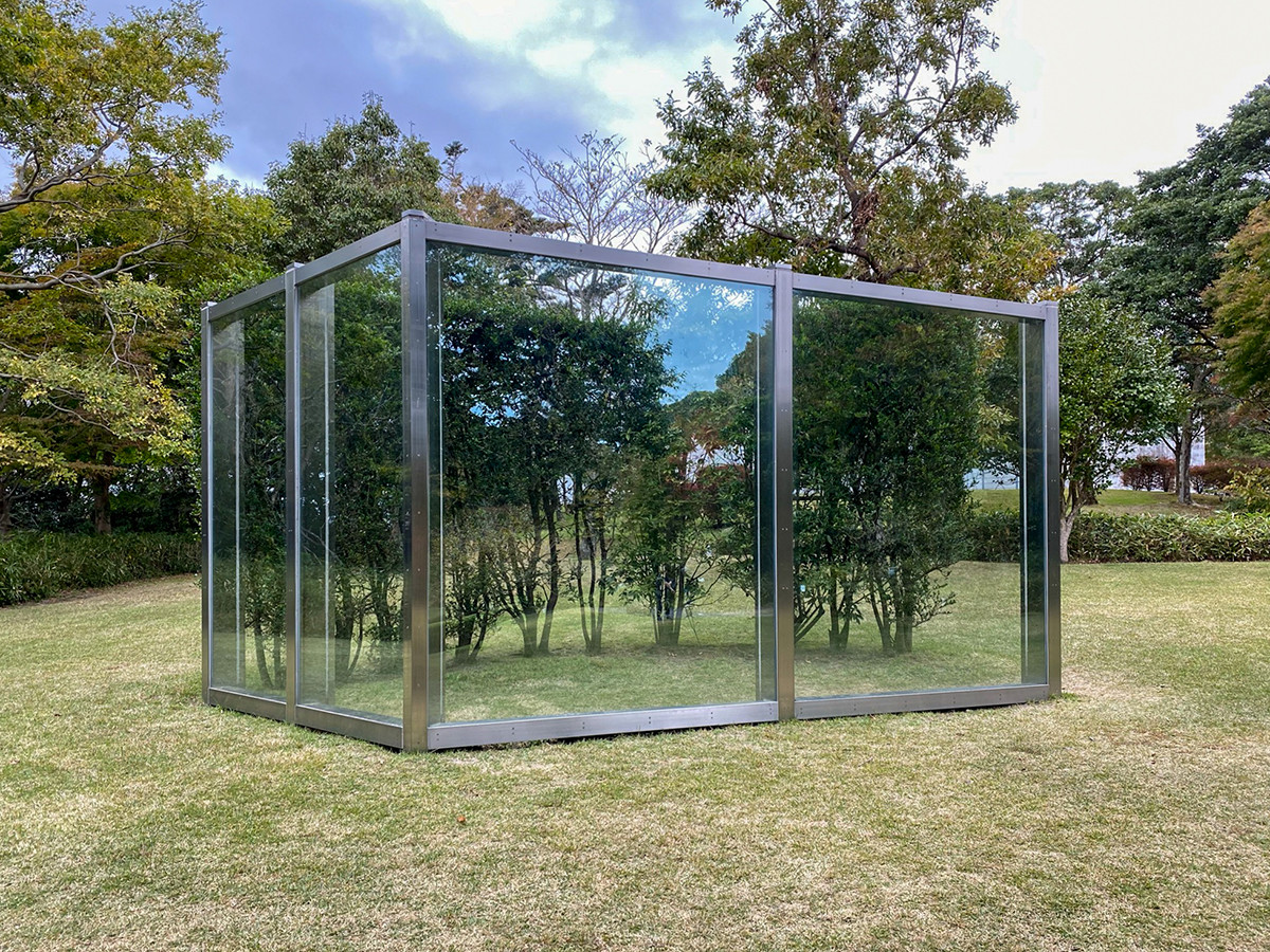 手入れされた芝生のエリアには作品が点在しています。こちらはダン・グレアム《反射ガラスとカーブした垣根の不完全な平行四辺形》。