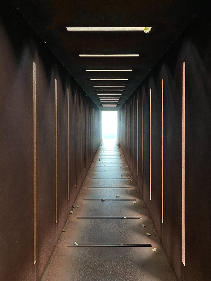 金属のトンネルのような作品で、奥に進むと息をのむような景色が広がります。