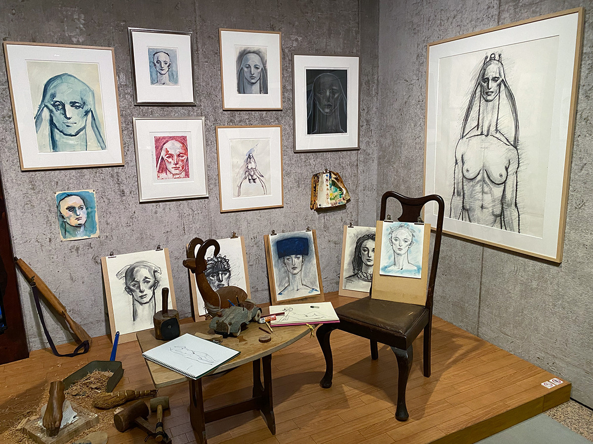 会場の隅には、舟越のアトリエも一部再現されています。机の天板や木槌などは、実際に舟越が使っているものです。