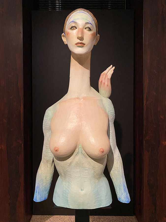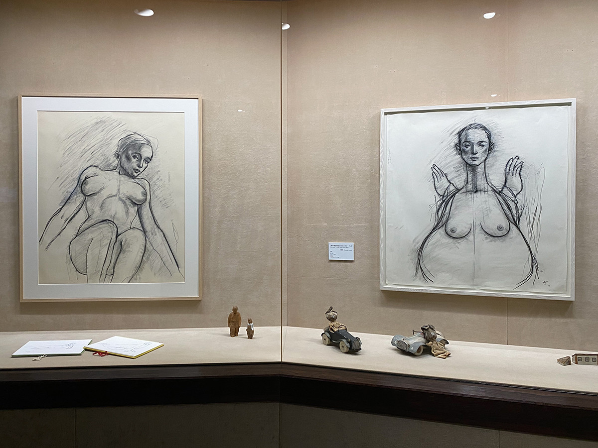 中央にある《水に映る月蝕》は、前述の《妻の肖像》以来、約23年ぶりに制作した裸体像。同じ木彫の裸体像ですが、その作風は大きく変わりました。肩がなく、腹部が丸く膨らんだ形は、デッサンをしたときに自然にイメージが見えてきたといいます。