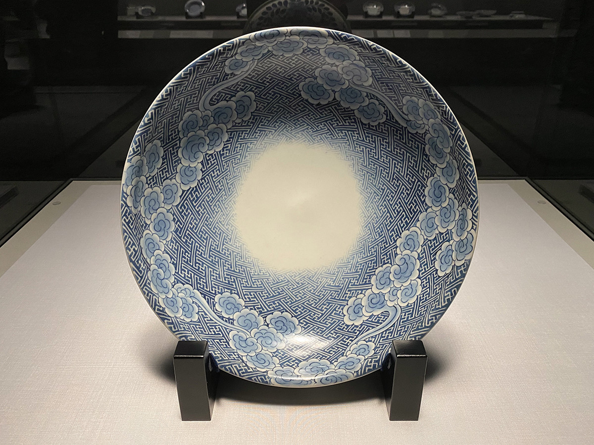「墨弾き」は、素焼きした皿の表面に、白抜きしたい文様を描き、その上から染付の濃を施すことで、墨描き部分が染付を弾いて白く残る、という技法。《染付雲雷文大皿》は、中心から縁に向かって墨弾きによる紗綾形文が回転しながら大きくなっており、まるで皿が発光しているかのように見えます。