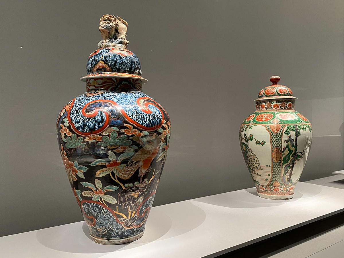 (左手前から)《色絵獅子鈕波鷹文大壺》江戸時代 18世紀 / 重要文化財《色絵花鳥文八角大壺》江戸時代 17~18世紀