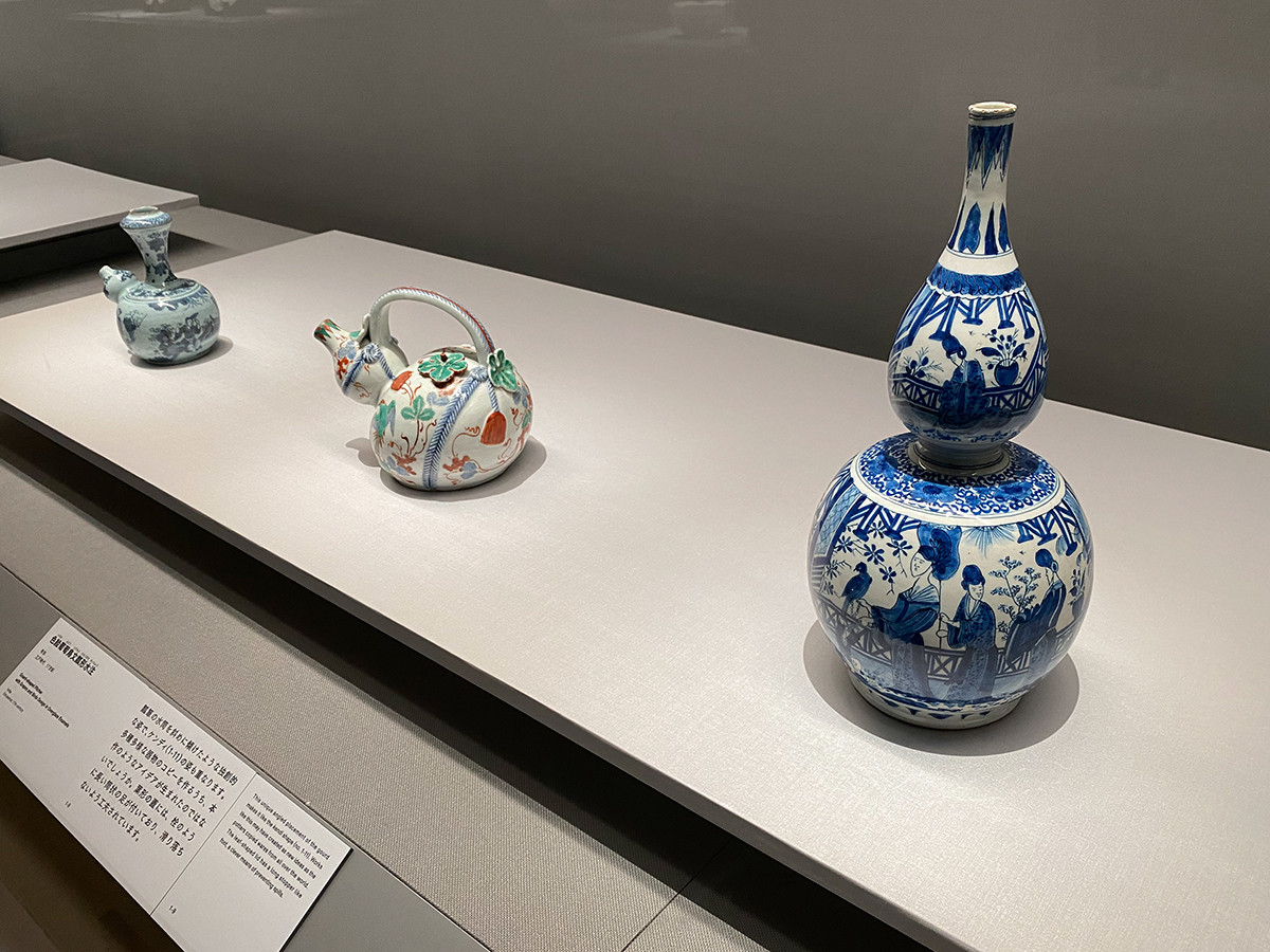 冒頭は展覧会を象徴する2点から。欧州の王侯に愛された六角形の《色絵花鳥文六角壺》は、明るい花鳥文が印象的。鮮やかなブルーの《藍色ちろり》は、把手にはヴェネツィアの、蓋のつくりには中国・北宋の影響が見て取れます。
