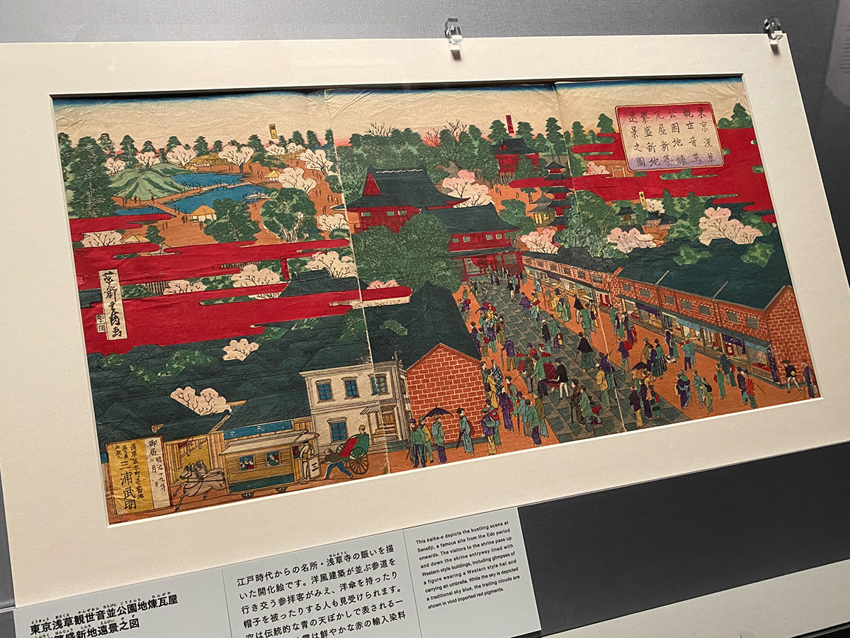 一方の《東京浅草観世音並公園地煉瓦屋新築繁盛新地遠景之図》は、幕末維新期の開化絵。浅草寺の周辺には洋風建築が立ち並び、洋傘や帽子姿の人もいます。この時期に入ってきた鮮やかな赤の輸入染料が多用されているのは、この時代の浮世絵の特徴といえます。