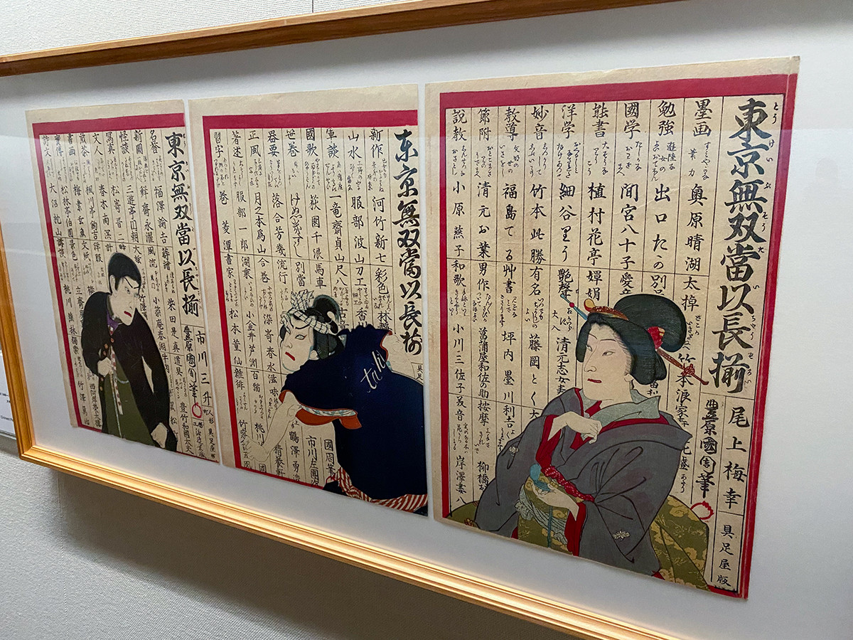 こちらは明治時代の作品で、各分野の有名人を背景にしたユニークな構成。左から九代目市川団十郎、初代市川左団次、五代目尾上菊五郎で、当時人気の「団菊左」です。