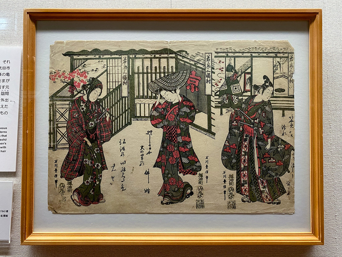 《若衆三幅対》は、華やかな衣装の3人の若衆。前述の市松模様や亀蔵小紋(市川亀蔵が流行らせた渦巻模様)など、流行の柄を取り入れています。