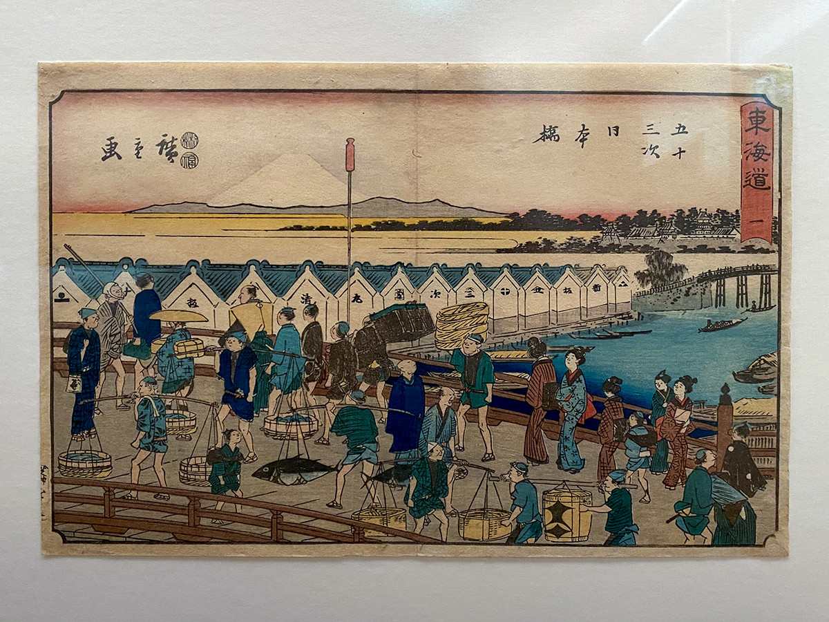 こちらは浮世絵でしばしば描かれる日本橋の姿。日本橋の北側には魚河岸があり、商人、町娘、武士など、さまざまな身分の人々が行き交いました。働く男性は着物の裾を帯に挟み、歩きやすい恰好です。