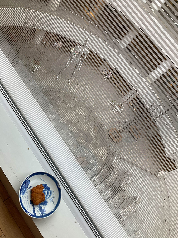 オペラシティの外の巨大オブジェに対して、窓際に揚げ物が供えられているように見えました。
