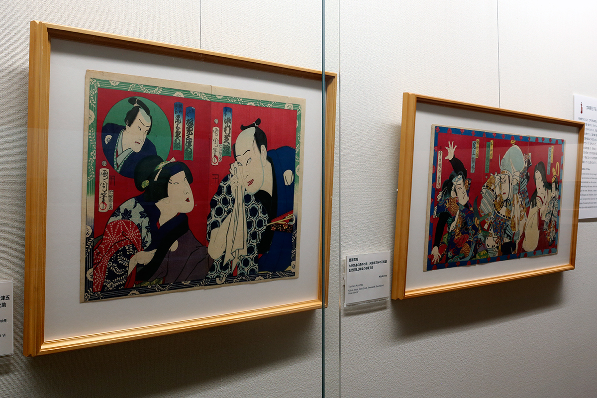 (左から)豊原国周《四代目中村芝翫の吃又平 六代目坂東三津五郎のおとく 五代目尾上菊五》 / 豊原国周《大谷紫道の典侍の局 河原崎三升の平知盛 五代目尾上梅幸の相模五郎》明治3年(1870)