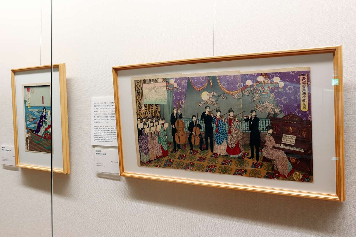 (左奥から)豊原国周《開化三十六会席 上野 西洋軒》明治11年(1878) / 楊洲周延《欧洲管絃楽合奏之図》明治22年(1989)5月
