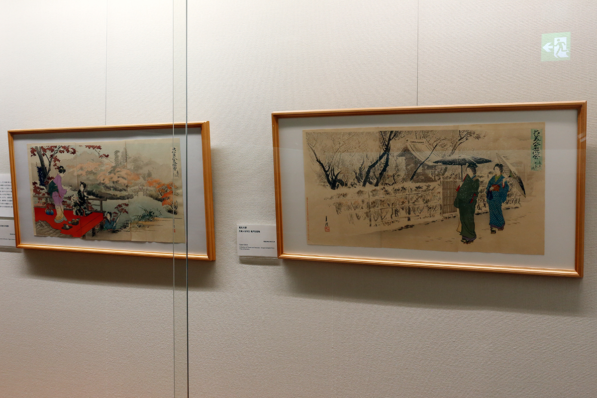 (左から)尾形月耕《花美人名所合 亀戸臥龍梅》明治28年(1895)12月 / 尾形月耕《花美人名所合 滝の川の紅葉》明治29年(1896)10月