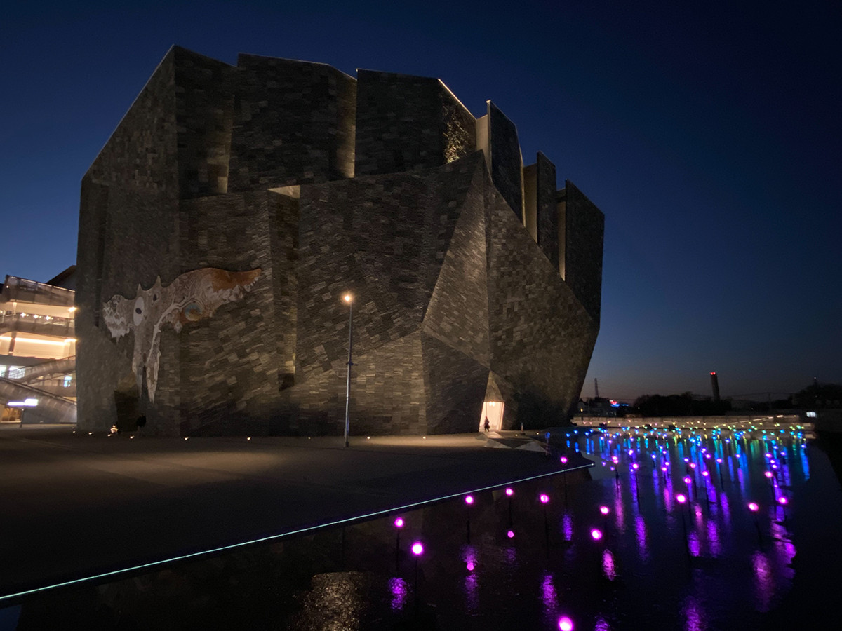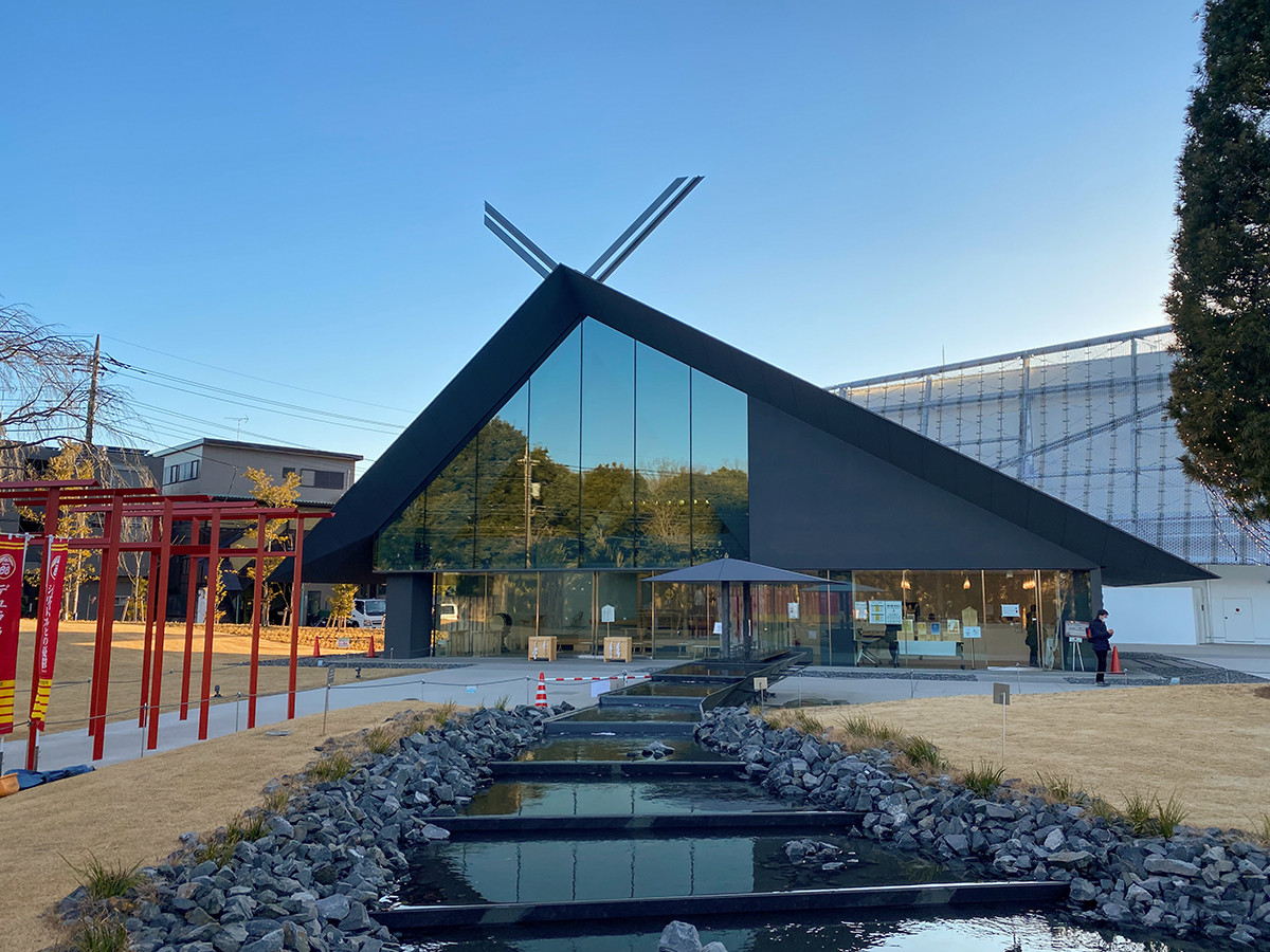 巨大な石の塊のように見える特徴的な建物は、隈研吾による設計。外壁には鴻池朋子《武蔵野皮トンビ》が1月に設置されました。