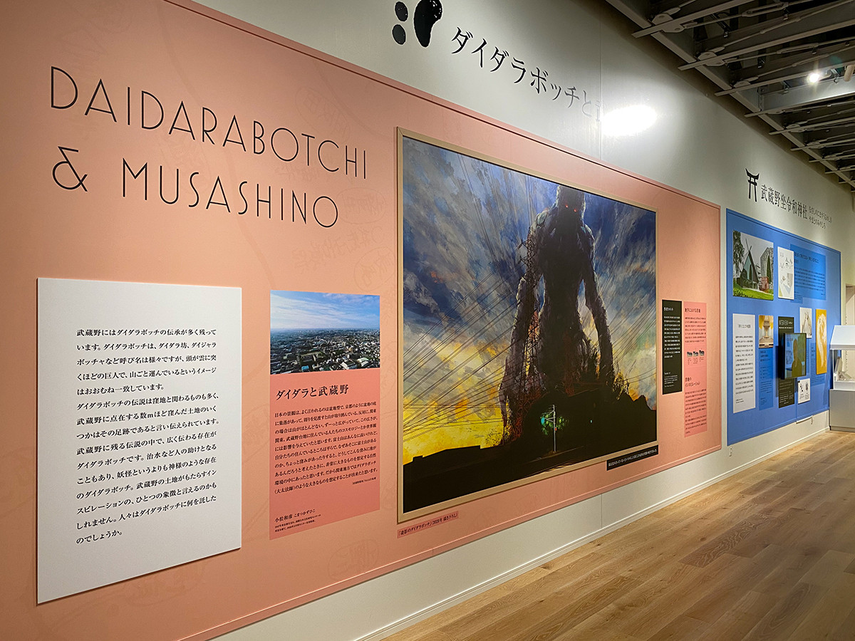 5階の「武蔵野ギャラリー」は「武蔵野三万年ことはじめ」展(10/31まで)。雑誌『武蔵野樹林vol.5』の特集との連動企画で、民俗学者・柳田国男と角川書店創業者・角川源義がどのように武蔵野を捉えていたのか考察します。武蔵野に伝承が数多く残る巨人「ダイダラボッチ」の巨大絵のほか、武蔵野の地形図の上にARでダイダラボッチが出現する楽しい展示もあります。