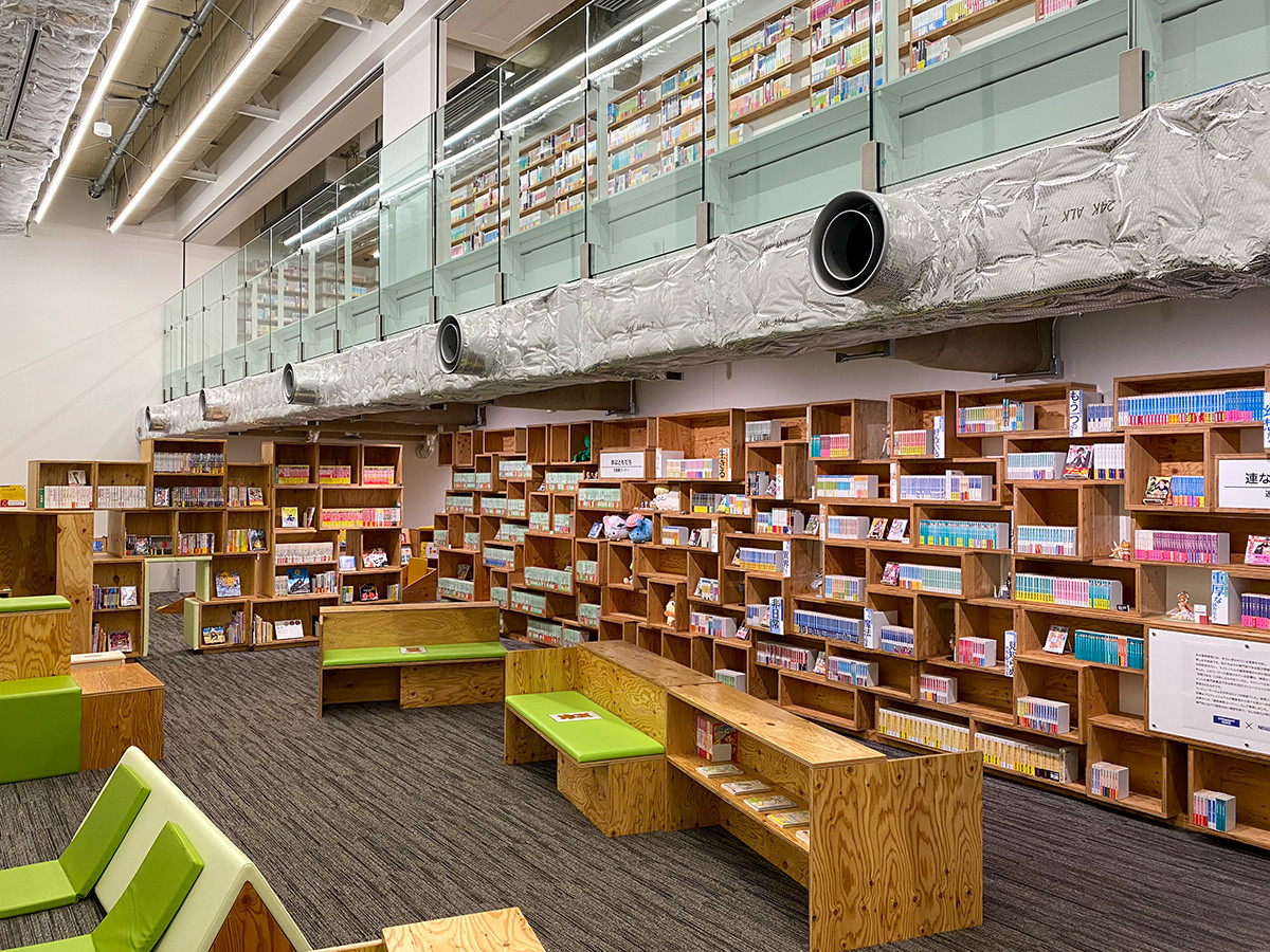 同じく1階の「マンガ・ラノベ図書館」は、KADOKAWAグループのほぼすべてのライトノベルが揃っている図書館です。中二階も含めて各所にベンチが設けられ、KADOKAWAが発信する「ラノベ・マンガ」の世界観をゆっくり楽しむことができます。奥には子ども向けのスペースも用意されています。