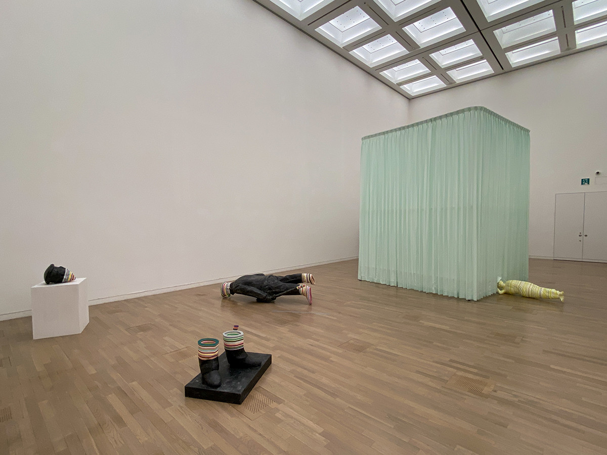 《軍神 -複製》は、東郷平八郎の立像をもとにした軍人像を横倒しにした作品。本来は権威的な像が、日常的なモノに近づいていきます。別の作品《アラニス》では、カーテンの中に頭を入れている涅槃像。そもそも寝ている涅槃像と、横倒しになった軍人像が同じ空間に存在する事は、今回の大きなテーマです。