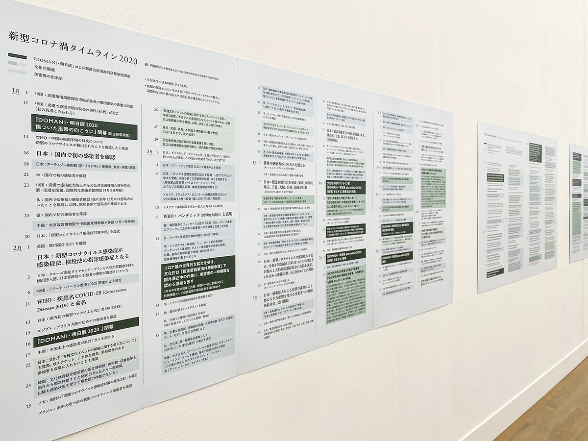 まず会場の冒頭には「新型コロナ禍タイムライン 2020」のパネルなどを展示。昨年夏から秋にかけてオンライン上で開催された「DOMANI・明日展plus online 2020」についても紹介されています。