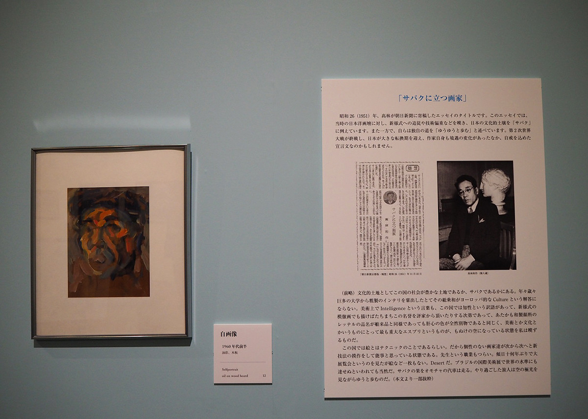 寄稿エッセイの一部と《自画像》1960年代前半 油彩、木板