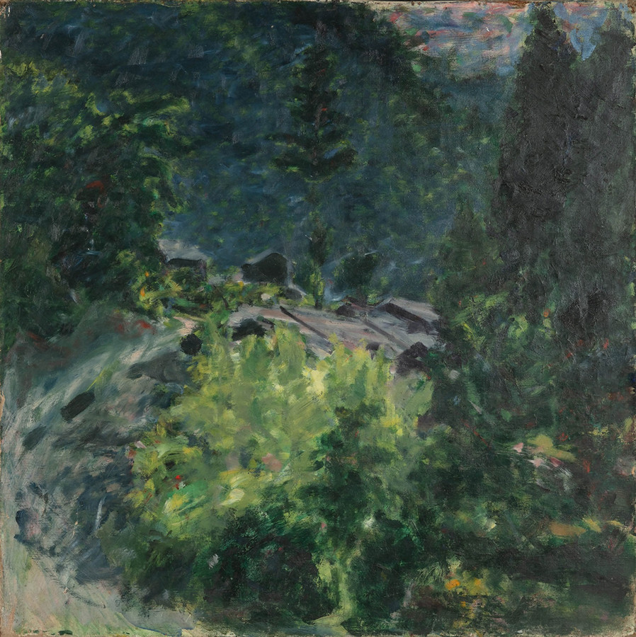 幾度も通い描いた《知恩院》は印象的です。紫と青で表現された建造物は逆光の中にあり、モネの《ルーアン大聖堂》を思い起こさせます。《初夏赤松》《河岸の秋》などでは、髙林がもっとも影響をうけたフォーヴィズムの様式が見てとれます。明るい色調にのびやかさを感じますが、彼の心のうちはそうでなかったようです。
