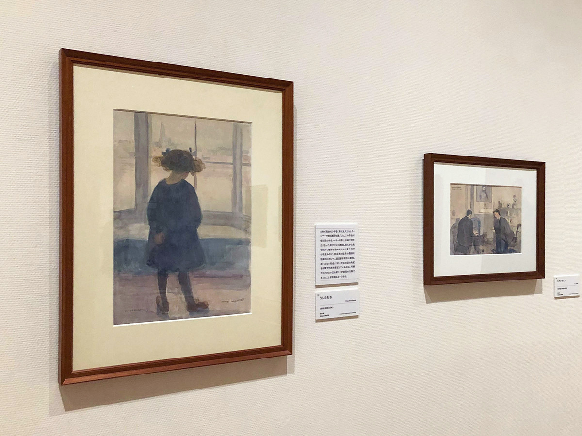 南がウィンザーで過ごした際に宿泊先で出会った少女を描いたのが《うしろむき》。水面や空をのびやかな構図で描き、柔らかな光を浴びたあどけない少女と街並みの濃淡を効果的に用いて、遠近感を表現しています。