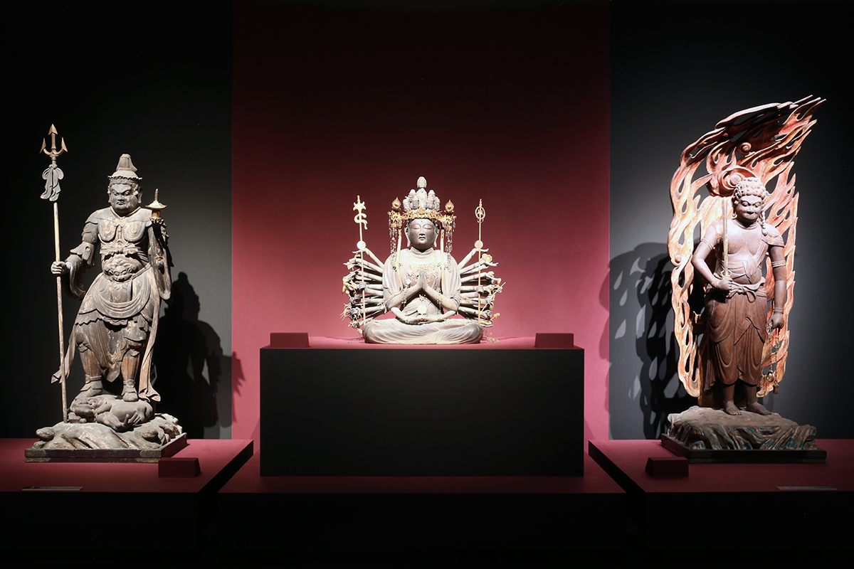 (左から)重要文化財《毘沙門天立像》慶尊作 平安時代 寿永3年(1184) / 重要文化財《千手観音菩薩坐像》経尋作 平安時代 12世紀 / 《不動明王立像》慶尊作 平安時代 12世紀 すべて徳島・雲辺寺[すべて全期間展示]