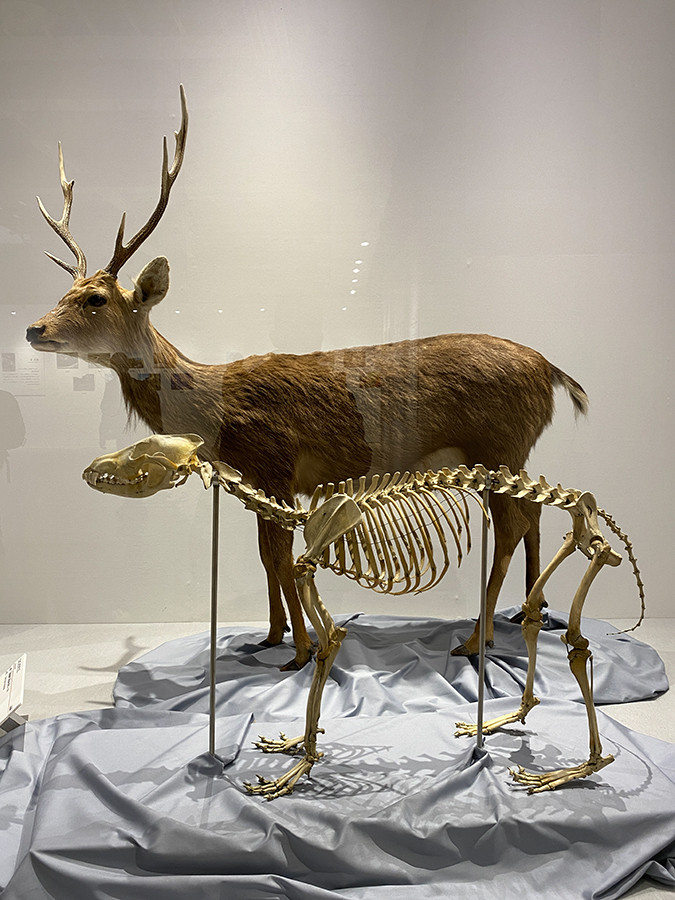 会場の最後に展示されているのが、ニホンオオカミの骨格標本と、ニホンジカの剥製。ニホンジカを獲物としていたニホンオオカミが絶滅してしまった事で、ニホンジカが急速に増加し、生態系や農業などに深刻な影響を与えているのは周知の事実です。