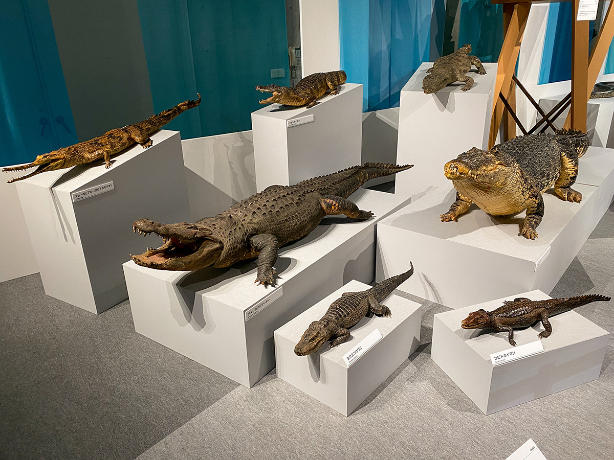 「水辺のハンター」には、ワニがずらり。ワニは約2億3000万年前に出現して以来、現生までほとんど形を変えずに水辺の生態系に君臨し続けているハンターです。