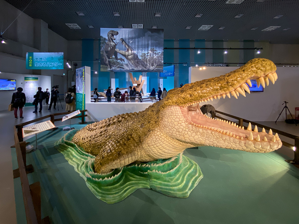 「太古のハンター」というと、すぐにティラノサウルスなどの大型肉食恐竜が思い浮かびますが、今回はワニ類に着目。会場の中央には、本展のために制作された中生代白亜紀の巨大ワニ「デイノスクス」の生体復元模型が鎮座しています。全長12メートルで、ティラノサウルス科の恐竜も捕食していたとされる強力なハンターです。