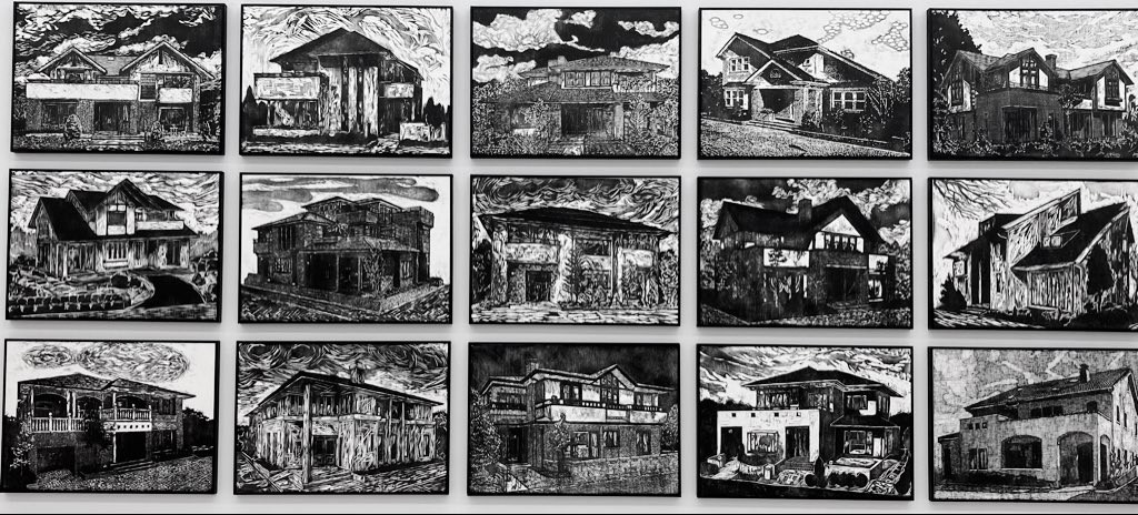 風間サチコさんの《存在の同じ家》は、折込チラシのモデルハウスの爽やかな光景を、バブル崩壊後の世紀末感が漂う怠い空気感へと移し替えたシリーズです。折込チラシの中のマイホームの夢を目標に生きるサラリーマンの明るい未来と、先行き不安な未来が織り交ざっています。