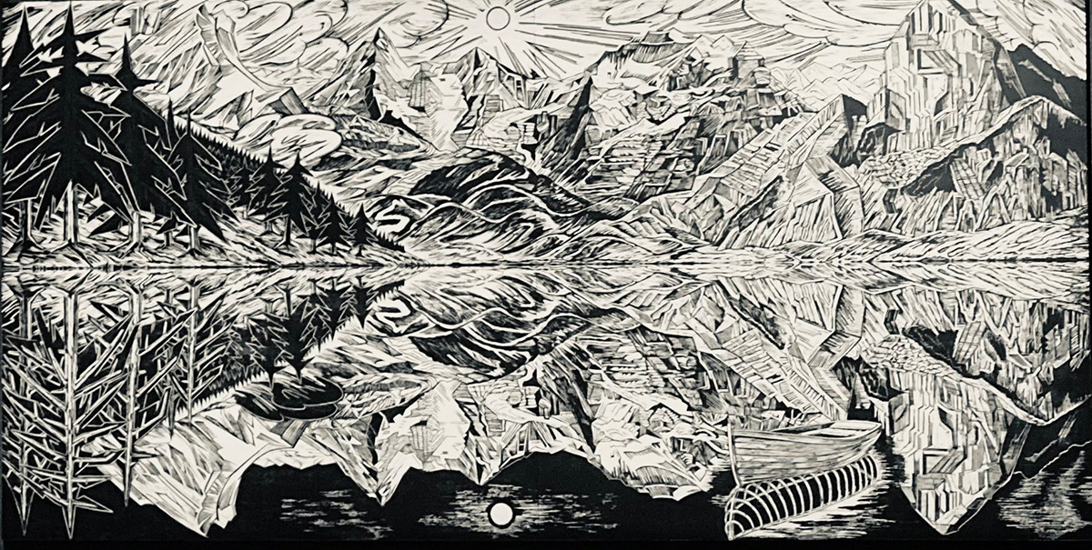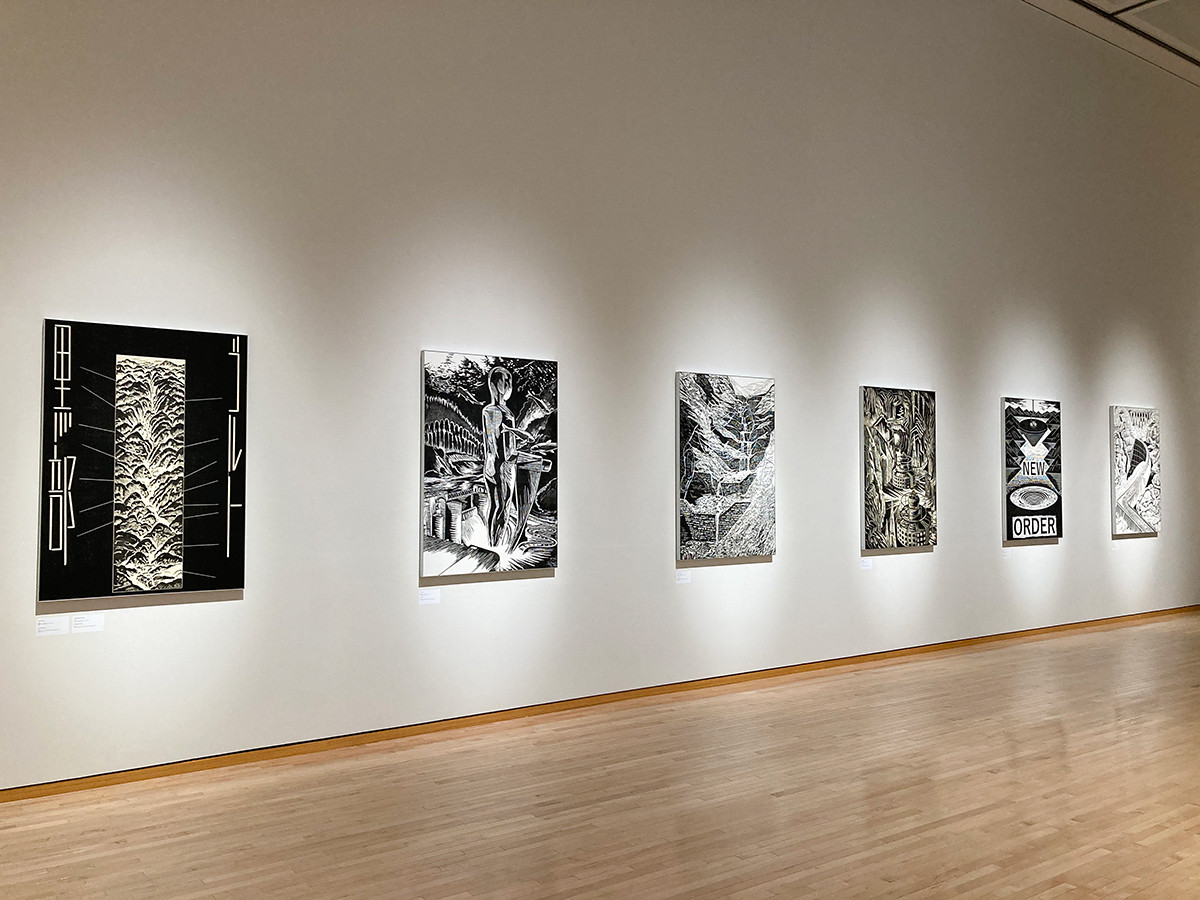 モノクロの濃淡で表現する木版画アーティストの風間サチコさんは、闇の歴史や先行き不安な未来や現代社会への批判を、コミカルなフィクションとして描き出しています。