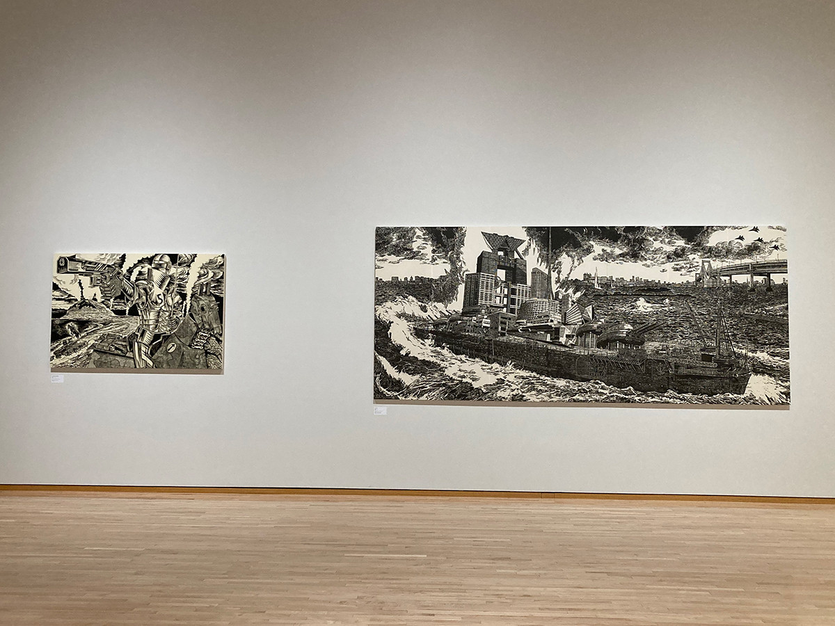 森美術館や東京都現代美術館に所蔵されているいくつかの大作をまとめて見ることができます。《人外交差点》は弘兼憲史さんの漫画「人間交差点」からの引用で、近未来の渋谷のスクランブル交差点での監視社会が描かれています。