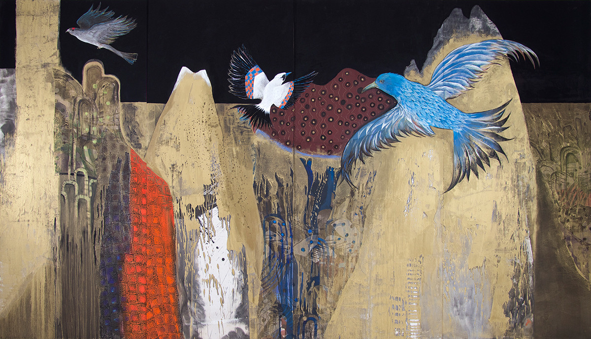 黒地に金色、青い鳥。 19世紀末の画家クリムトの作品にインスピレーションを得て描いたものだそうです。