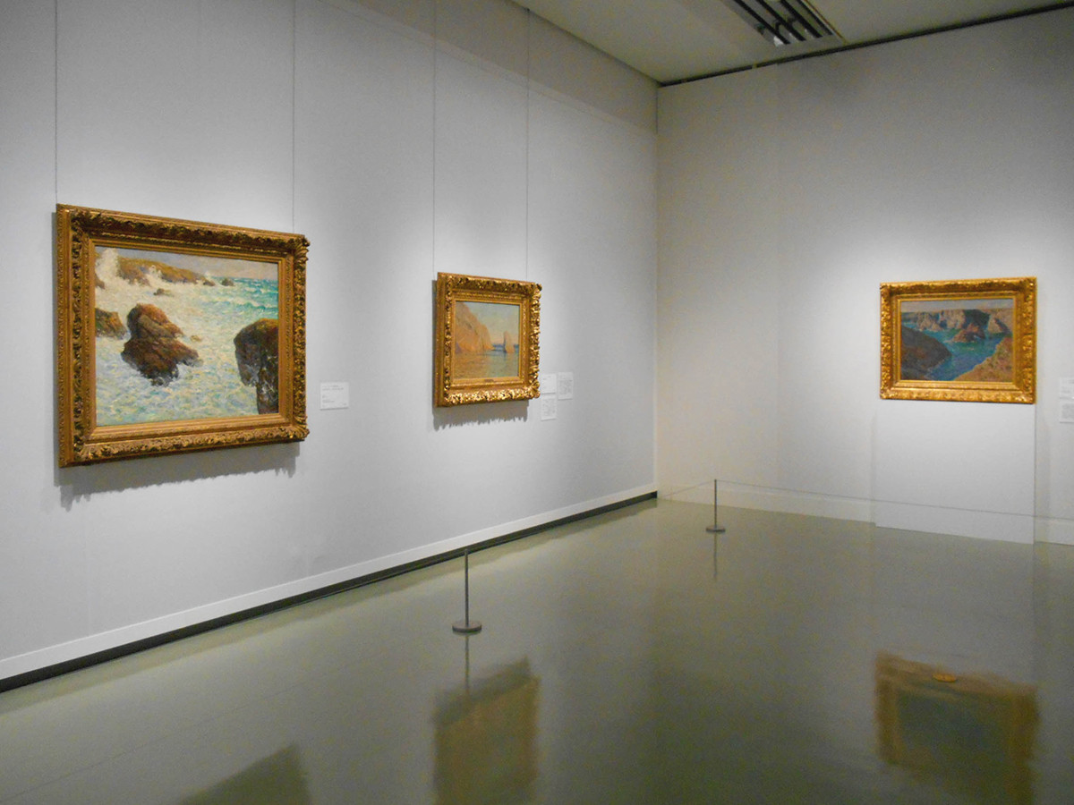 右端の作品は、モネの≪ベリールの岩礁≫です。海面に空が写っていて、その部分に薄くピンクがぬり重ねられ、紫色にも見えます。夕焼けの色なのか、大胆な色遣いに思えました。