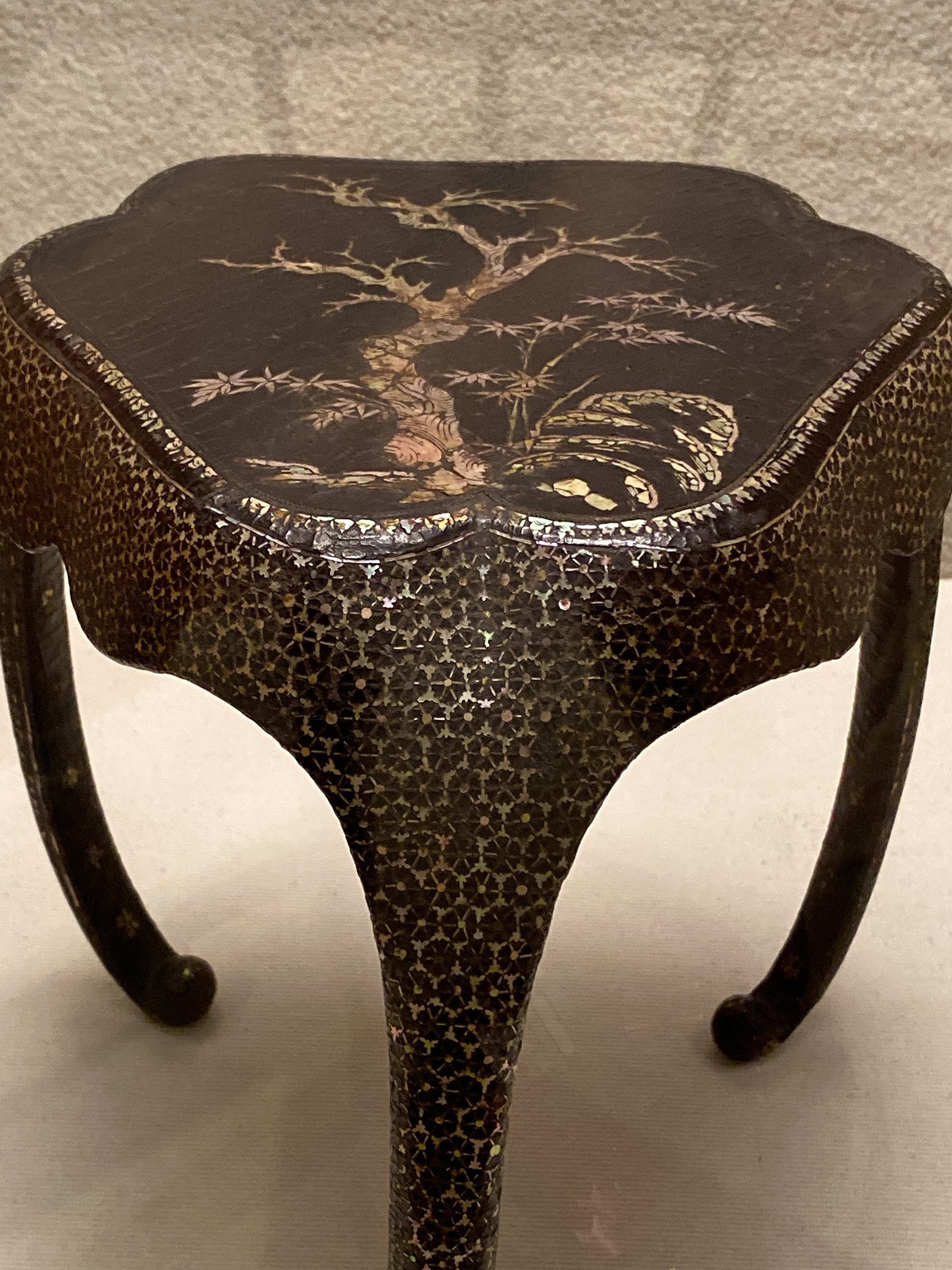 黒々とした漆の卓全面に施された螺鈿は、ため息が出るほどです。西洋の金や宝石で飾られたきらびやかさと違い、細かな螺鈿装飾はしっとりと上品に光り東洋的な美しさが表現されています。天板の竹や石の模様は不死や友情などを表す吉祥的な意味があるそうです。