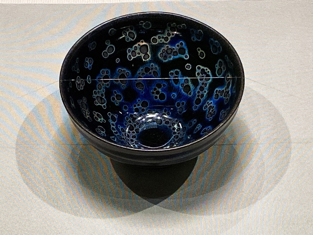 こちらはご存知、国宝の曜変天目で、完全な形のものは世界中に3点しか存在しないそうです。深い青色の中に点在する斑紋は、見上げる夜空の中の星たちのようです。