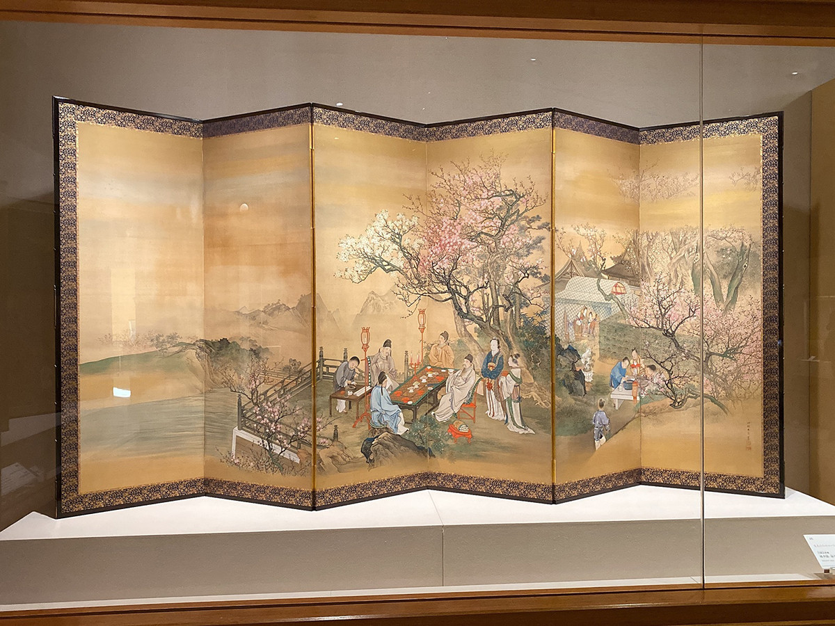 川端玉章《桃李園・独楽園図屏風》は、会期前期は右隻の《桃李園》、後期は左隻の《独楽園》の展示です。《桃李園》は桃やスモモが咲き乱れた樹の下で、李白たちが詩を読みながら酒宴を楽しんでいる様子が描かれています。満開の花の下でウキウキしてしまう気持ちは、古今東西共通なのですね。