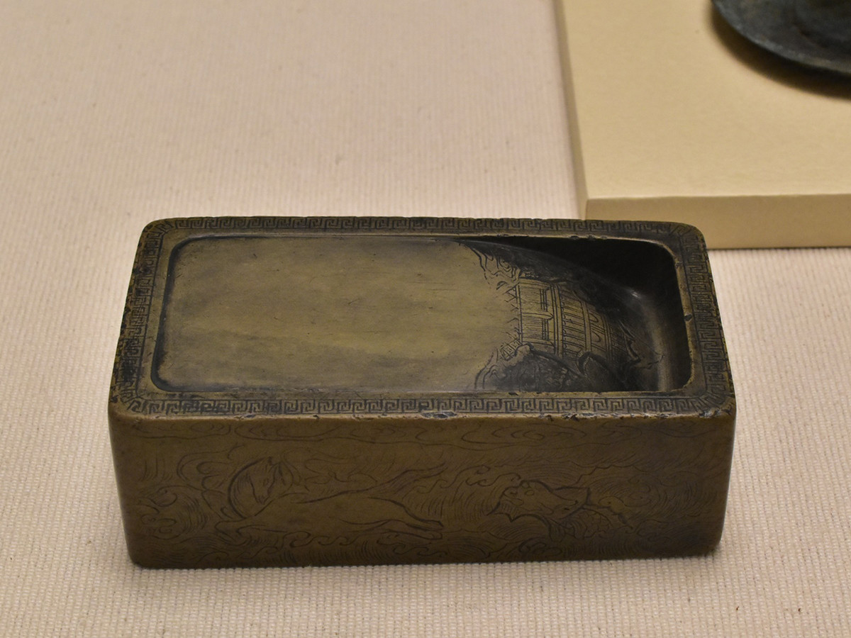 明時代に作られたこちらの硯は、墨池に楼閣、側面には亀や魚などたくさんの動物が彫り出されています。