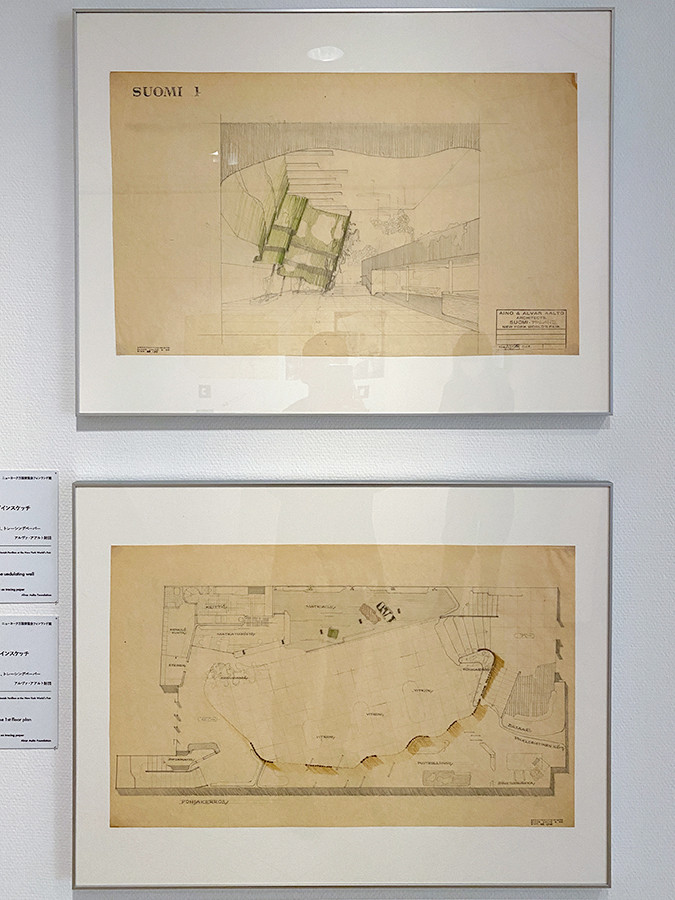 1939年のニューヨーク万国博覧会では、フィンランド館の設計を担当。割り当てられた建物の内部に高く前傾したうねる壁を設置。低い位置からも展示が見えるとともに、包み込まれるような感覚も生まれます。本展の会場にも、万博での試みを模した壁面を設置、ダイナミックな構成でアアルトの世界を体感追できます。