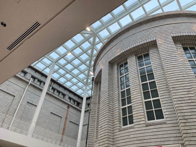 ここは、元々屋外の中庭であったところにガラスの大屋根をかけて、光の広間とし、レセプションなどが行えるようになりました。80年余の歳月を経た建物外壁とそれを覆うガラスの大屋根が違和感なく共存しています。