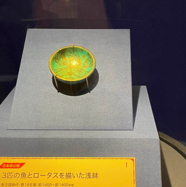 古代エジプトでは、この世界の始まりは、「原初の海」のヌンの中にあったと考えられていました。天地創造の象徴である魚とロータス(睡蓮)を描くこの美しいコバルトブルーの浅鉢は、図録の作品番号がNo1ですが、展示の最後に置かれています。循環・再生を暗示しています。